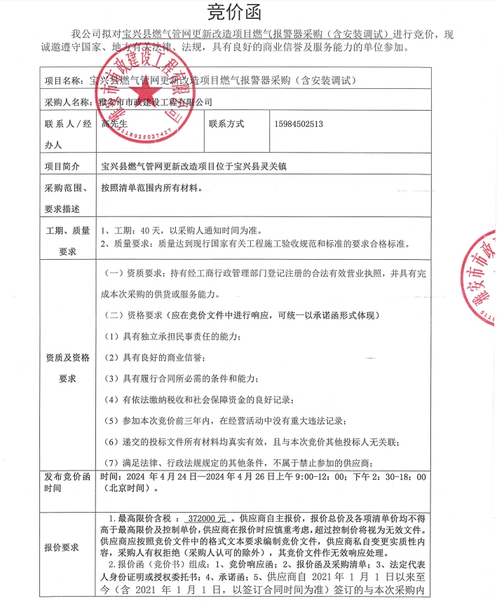 寶興縣燃?xì)夤芫W(wǎng)更新改造項(xiàng)目燃?xì)鈭?bào)警器采購(gòu)(含安裝調(diào)試)競(jìng)價(jià)公告