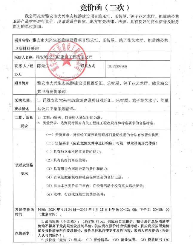 雅安市大興生態(tài)旅游建設(shè)項目雅樂匯、樂智屋、鴿子花藝術(shù)廳、能量站公共衛(wèi)浴材料采購(第二次)競價公告
