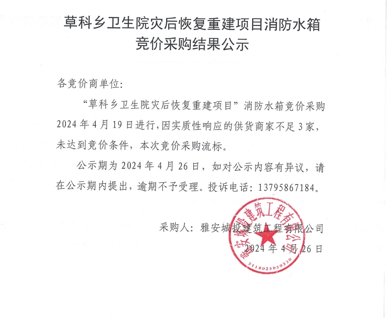 草科鄉(xiāng)衛(wèi)生院災(zāi)后恢復(fù)重建項目消防水箱競價采購結(jié)果公示