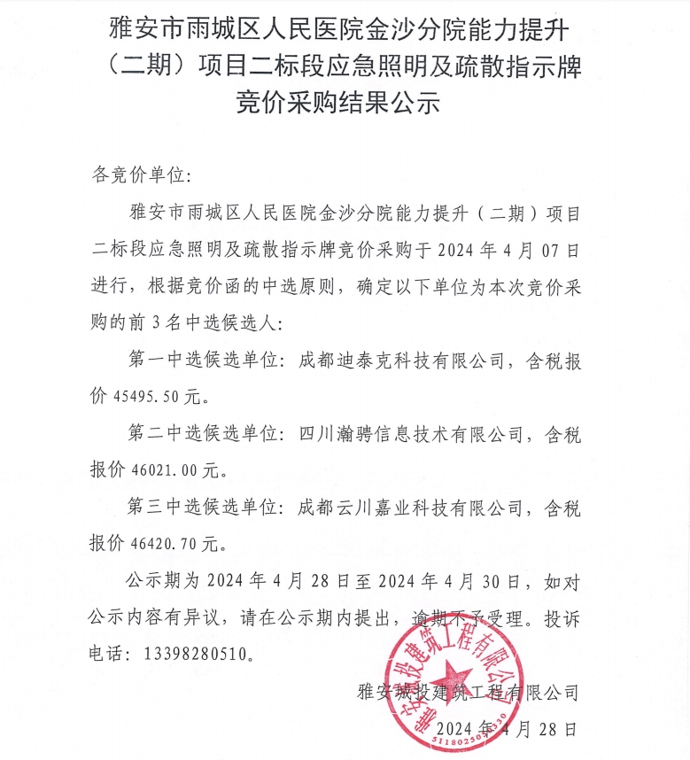 雅安市雨城區(qū)人民醫(yī)院金沙分院能力提升(二期)項目二標(biāo)段應(yīng)急照明及疏散指示牌競價采購結(jié)果公示