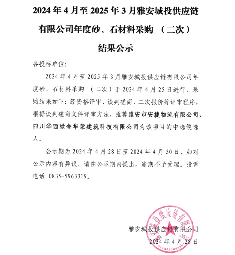 2024年4月至2025年3月雅安城投供應鏈有限公司年度砂、石材料采購(二次)結(jié)果公示