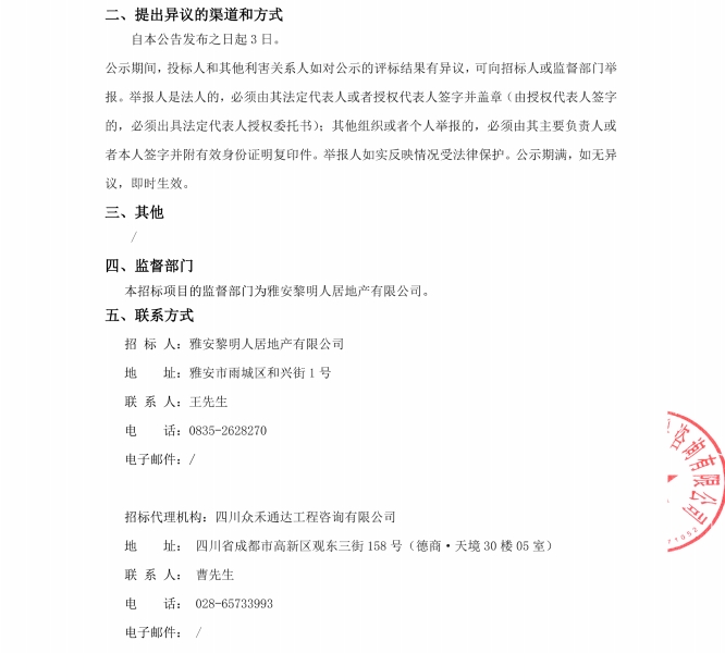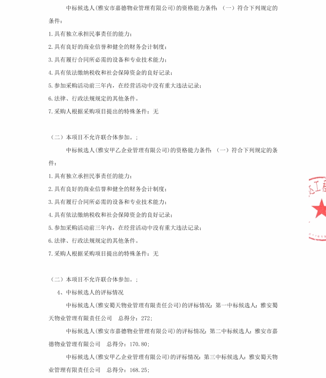 雅州壹號院臨時(shí)售樓部物業(yè)服務(wù)中標(biāo)候選人公示