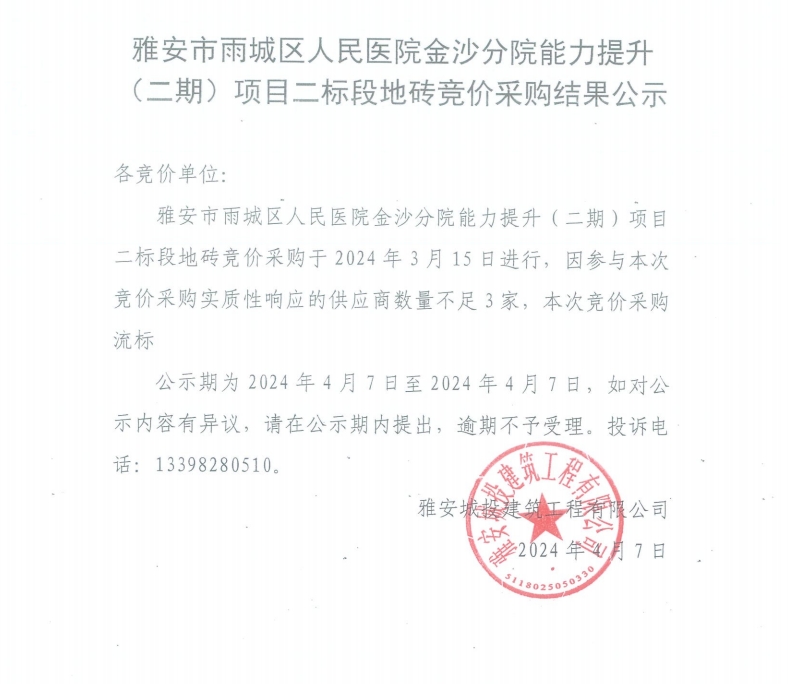 雅安市雨城區(qū)人民醫(yī)院金沙分院能力提升(二期)項(xiàng)目二標(biāo)段地磚競(jìng)價(jià)采購(gòu)結(jié)果公示