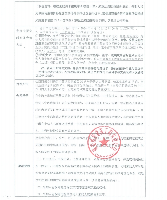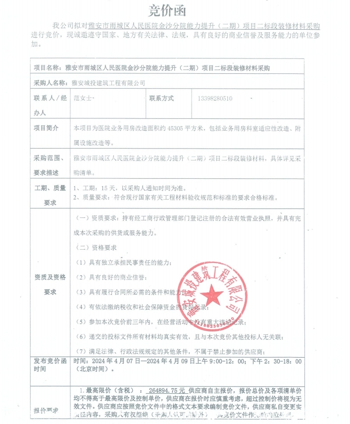 雅安市雨城區(qū)人民醫(yī)院金沙分院能力提升(二期)項目二標(biāo)段裝修材料采購競價公告