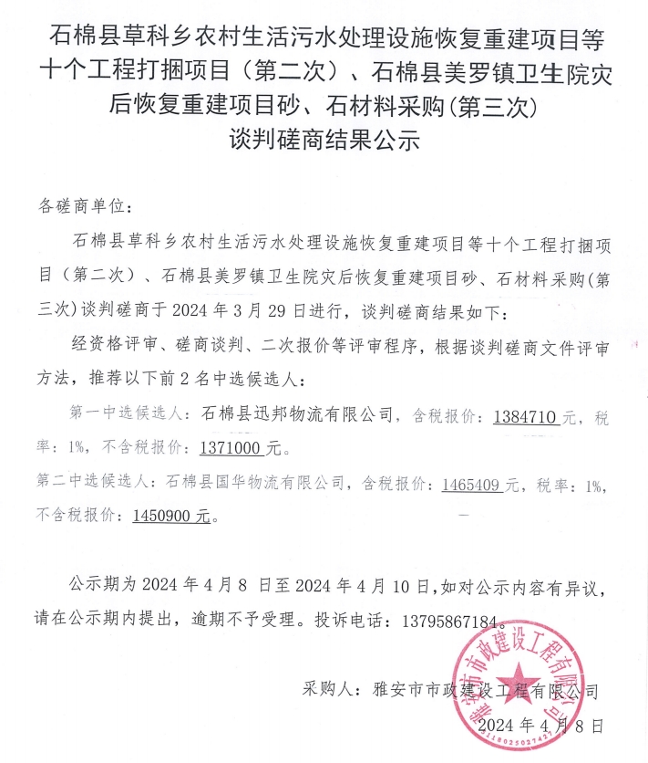 石棉縣草科鄉(xiāng)農(nóng)村生活污水處理設施恢復重建項目等十個工程打捆項目(第二次)、石棉縣美羅鎮(zhèn)衛(wèi)生院災后恢復重建項目砂、石材料采購(第三次)談判磋商結(jié)果公示