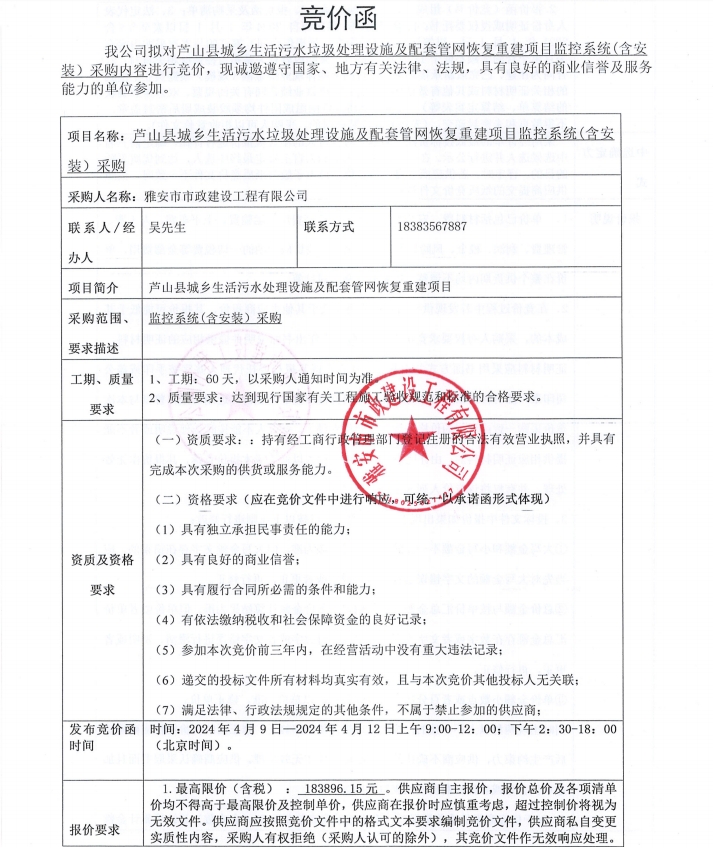 蘆山縣城鄉(xiāng)生活污水垃圾處理設施及配套管網(wǎng)恢復重建項目監(jiān)控系統(tǒng)(含安裝)采購內(nèi)容競價公告