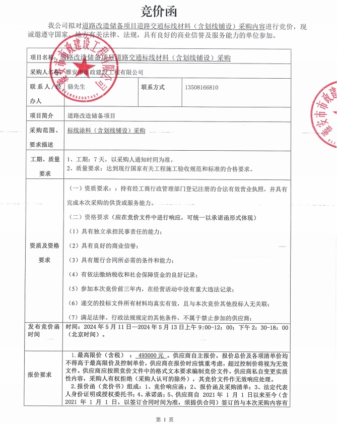 道路改造儲備項目道路交通標線材料(含劃線鋪設)采購競價公告