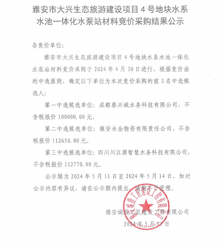 雅安市大興生態(tài)旅游建設項目4號地塊水系水池一體化水泵站材料競價采購結(jié)果公示