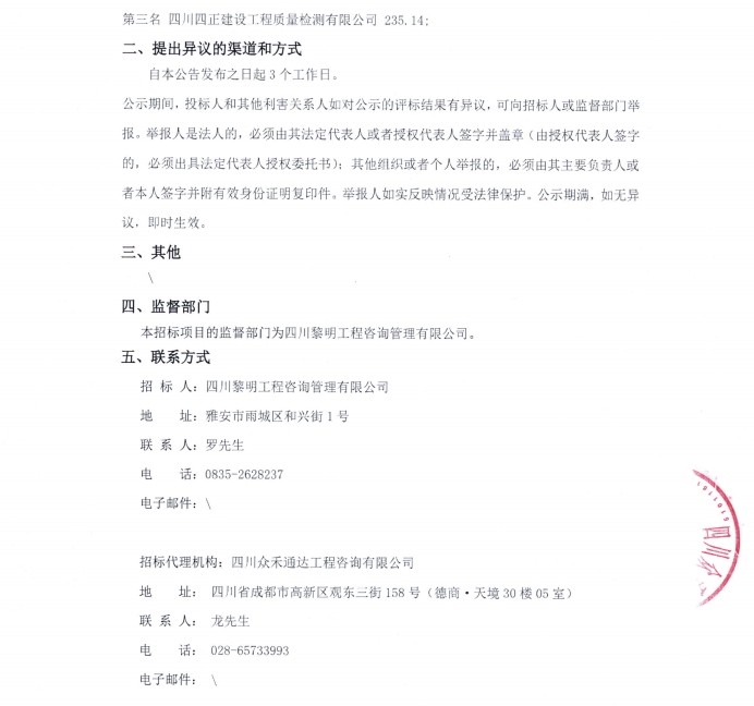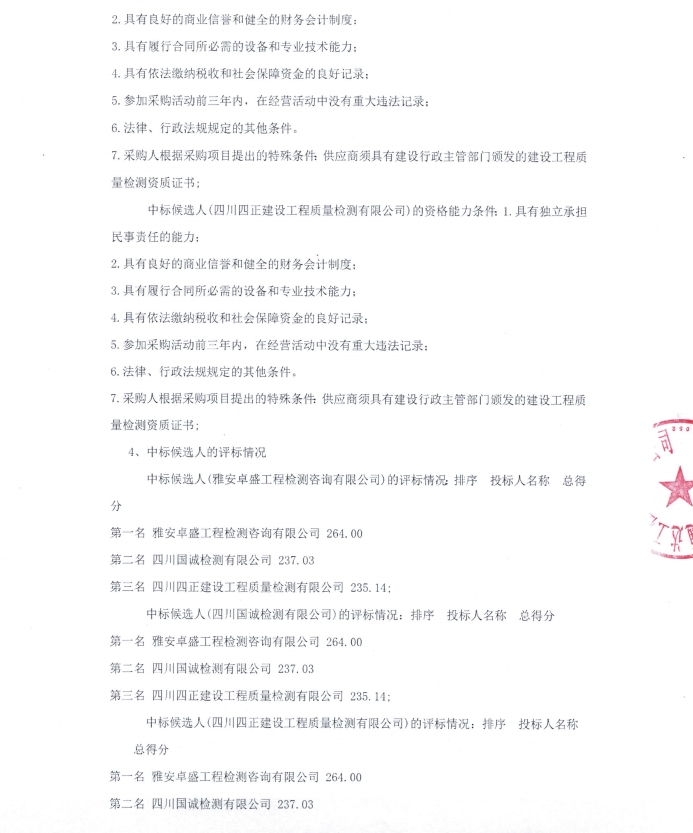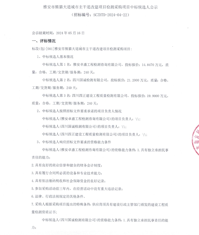 雅安市熊貓大道城市主干道改建項(xiàng)目檢測(cè)采購項(xiàng)目中標(biāo)候選人公示