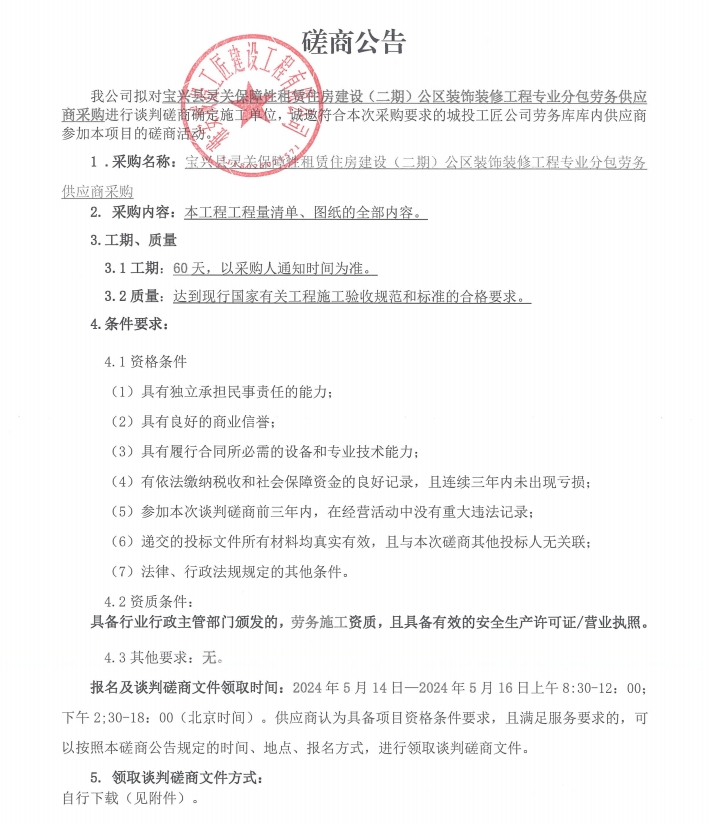 寶興縣靈關保障性租賃住房建設(二期)公區(qū)裝飾裝修工程專業(yè)分包勞務供應商采購談判磋商公告