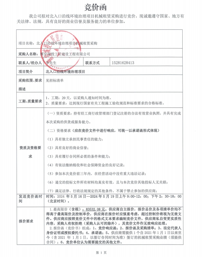 北入口沿線環(huán)境治理項目機(jī)械租賃采購競價公告