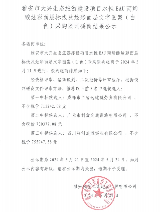 雅安市大興生態(tài)旅游建設項目水性EAU丙烯酸炫彩面層標線及炫彩面層文字圖案(白色)采購談判磋商結(jié)果公示