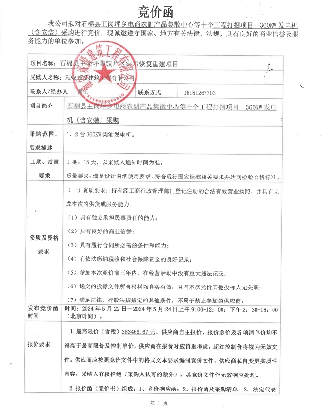 石棉縣王崗坪鄉(xiāng)電商農副產品集散中心等十個工程打捆項目--360KW發(fā)電機(含安裝)采購競價公告