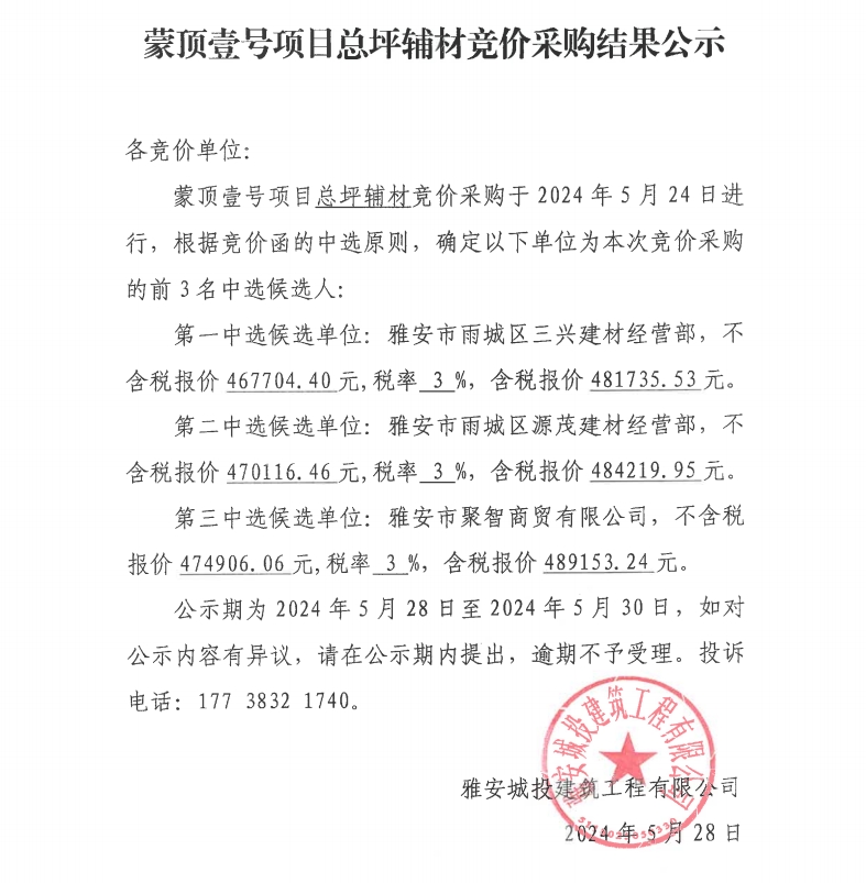 蒙頂壹號(hào)項(xiàng)目總坪輔材競(jìng)價(jià)采購結(jié)果公示
