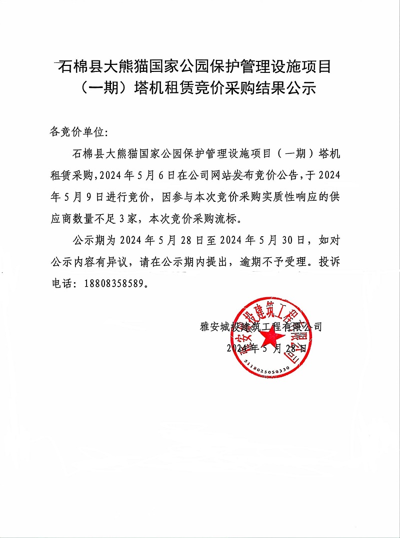 石棉縣大熊貓國(guó)家公園保護(hù)管理設(shè)施項(xiàng)目(一期)塔機(jī)租賃競(jìng)價(jià)采購(gòu)結(jié)果公示