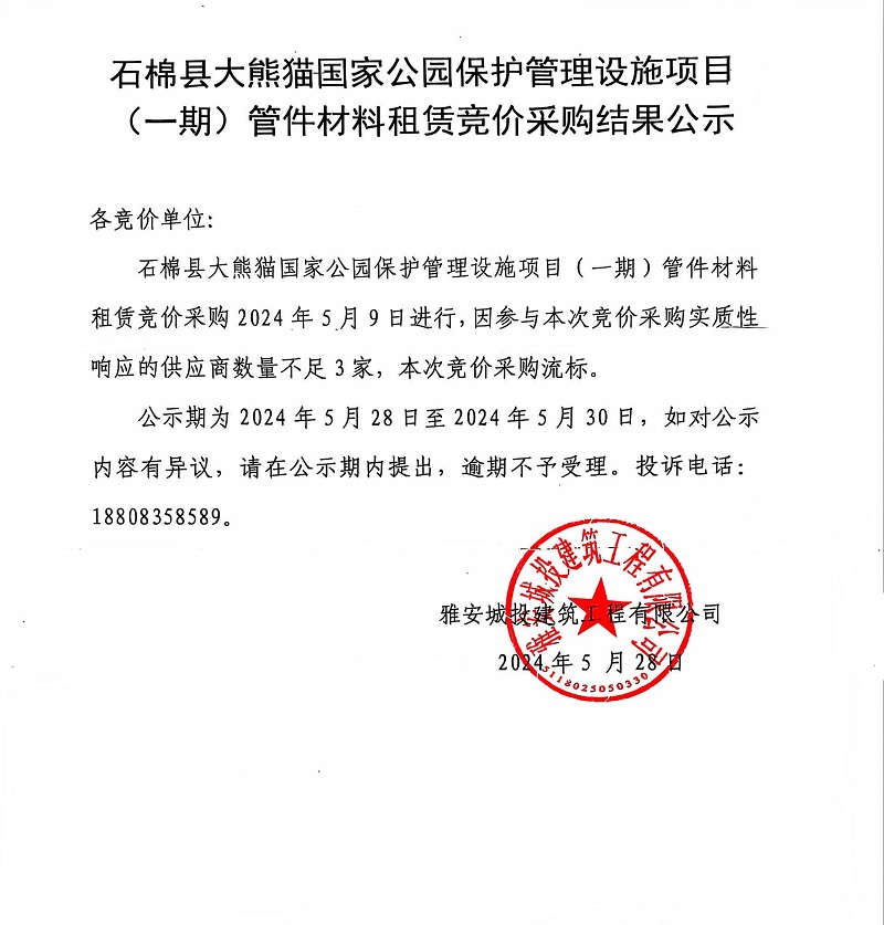 石棉縣大熊貓國家公園保護管理設施項目(一期)管件材料租賃競價采購結果公示