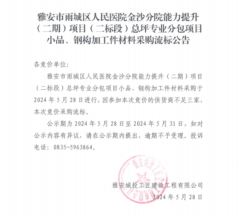 雅安市雨城區(qū)人民醫(yī)院金沙分院能力提升(二期)項(xiàng)目(二標(biāo)段)總坪專(zhuān)業(yè)分包項(xiàng)目小品、鋼構(gòu)加工件材料采購(gòu)流標(biāo)公告