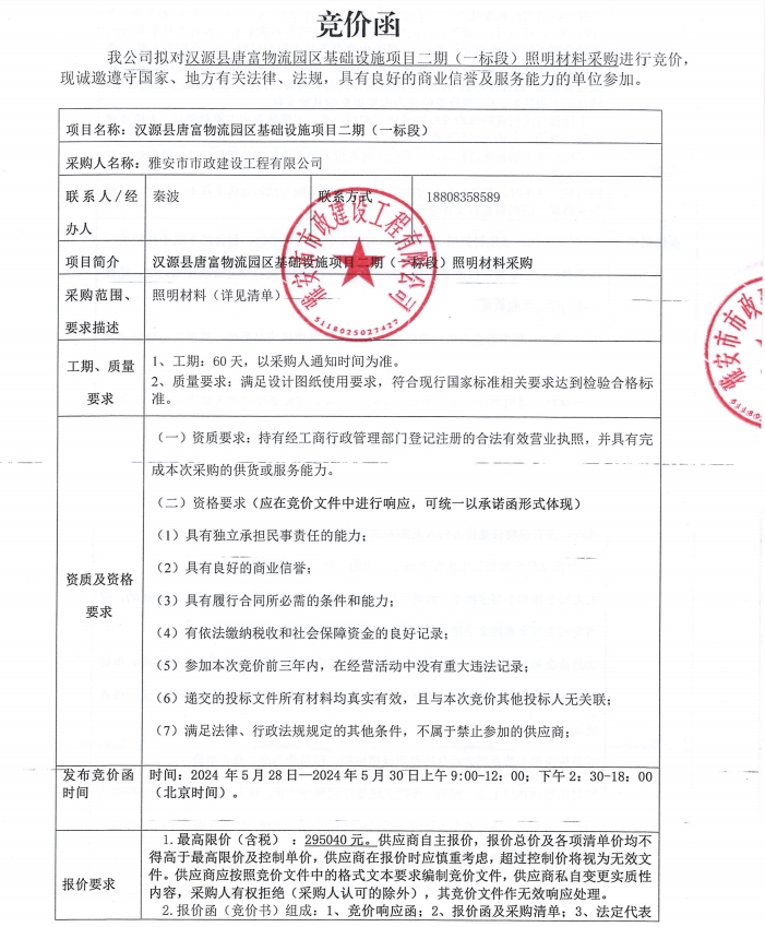 漢源縣唐富物流園區(qū)基礎設施項目二期(一標段)照明材料采購競價公告