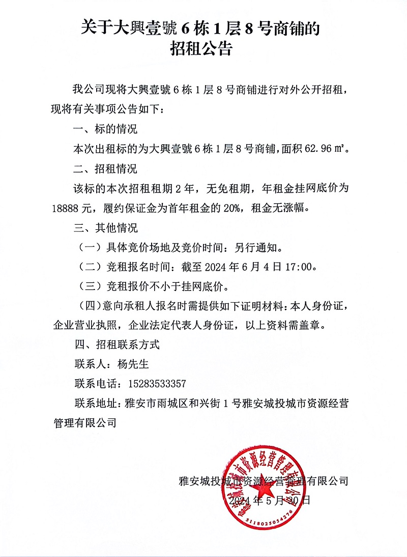 關(guān)于大興壹號(hào)6棟1層8號(hào)商鋪的招租公告