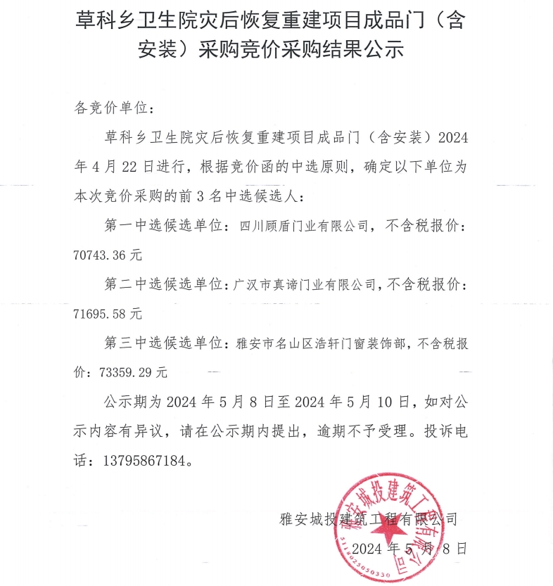 草科鄉(xiāng)衛(wèi)生院災(zāi)后恢復(fù)重建項目成品門(含安裝)采購競價采購結(jié)果公示