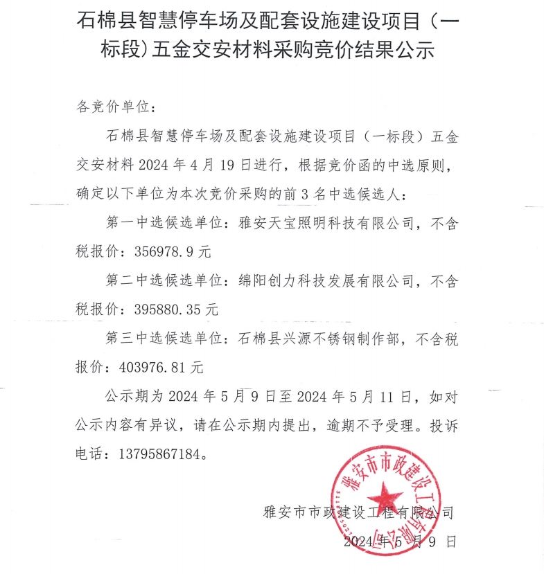石棉縣智慧停車場及配套設(shè)施建設(shè)項目(一標(biāo)段)五金交安材料采購競價結(jié)果公示