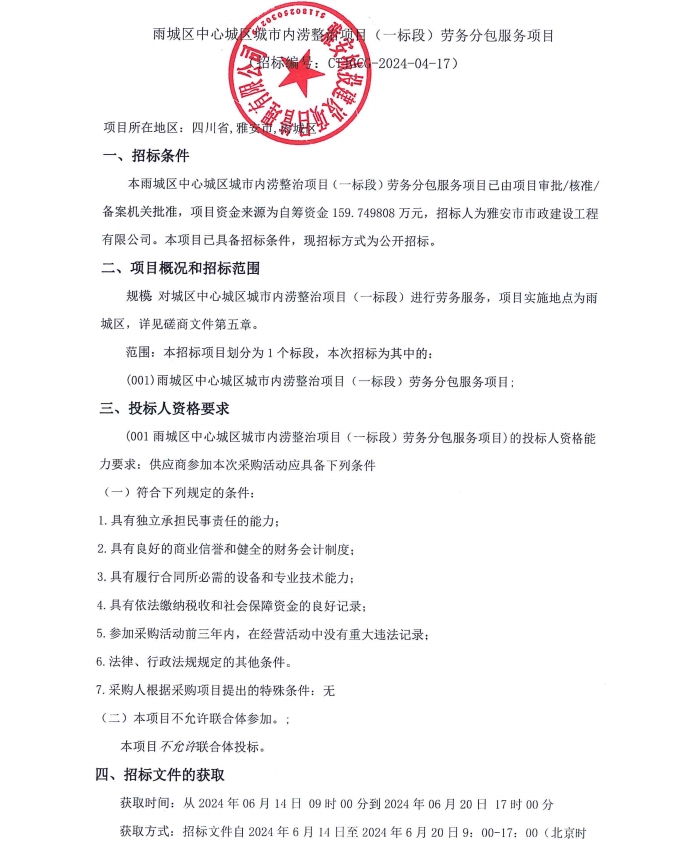 雨城區(qū)中心城區(qū)城市內(nèi)澇整治項目(一標(biāo)段)勞務(wù)分包服務(wù)項目公告