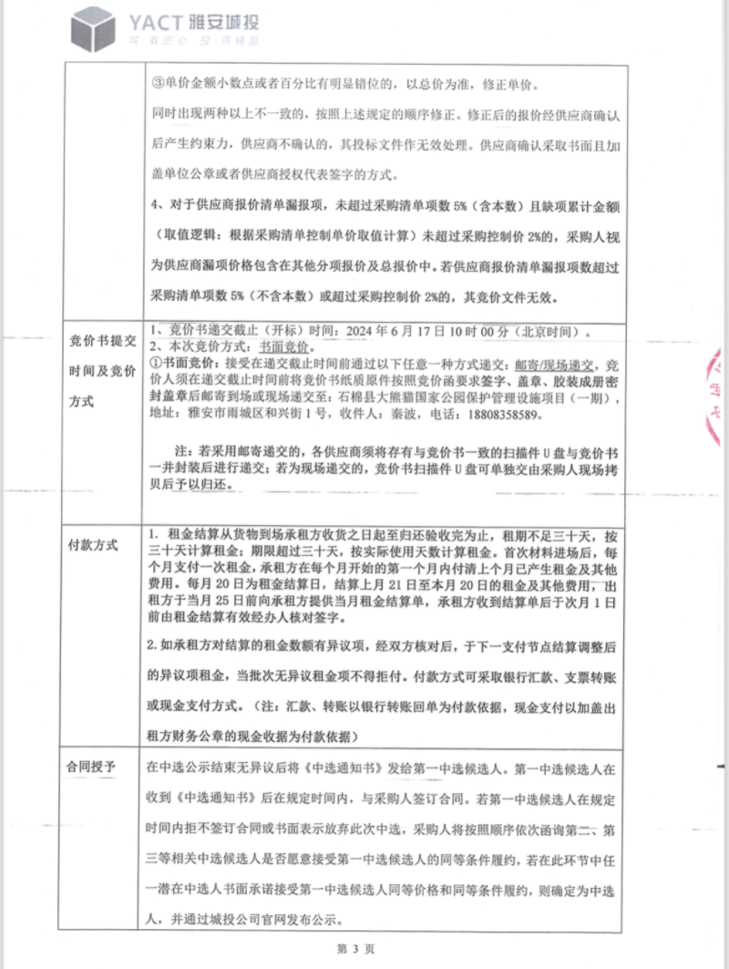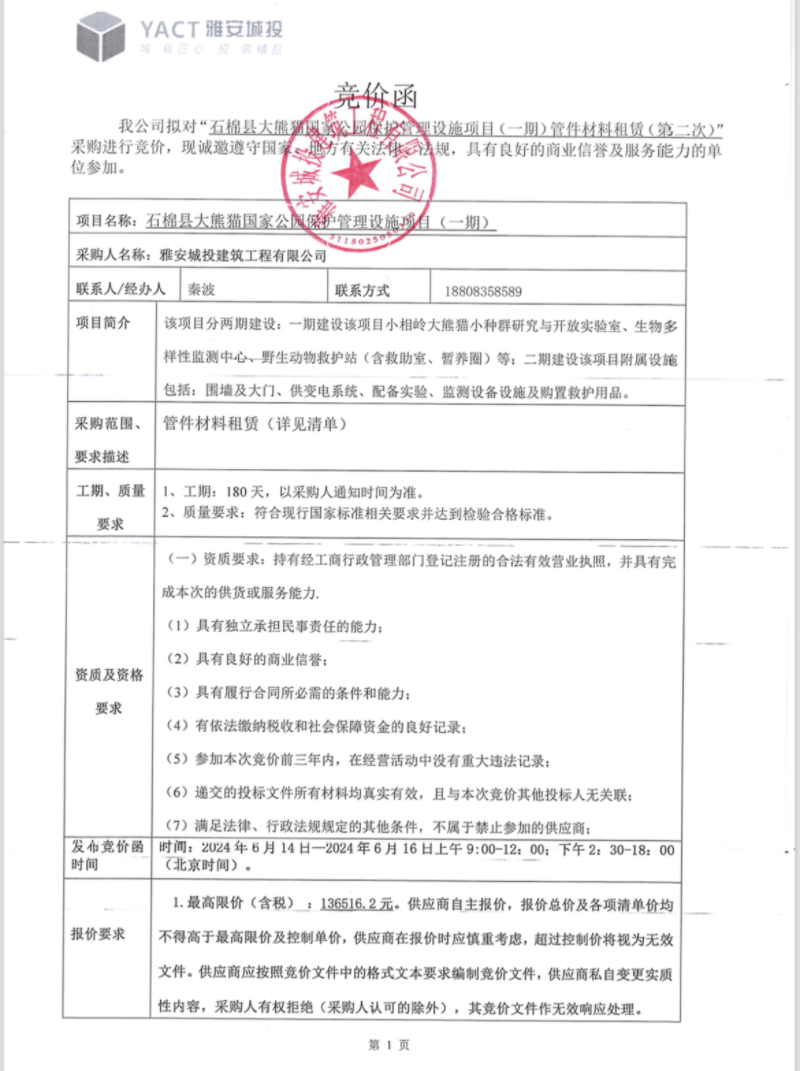 石棉縣大熊貓國(guó)家公園保護(hù)管理設(shè)施項(xiàng)目(一期)管件材料租賃(第二次)競(jìng)價(jià)公告