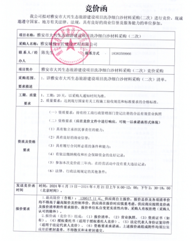 雅安市大興生態(tài)旅游建設(shè)項目洗凈細(xì)白沙材料采購(二次)競價公告
