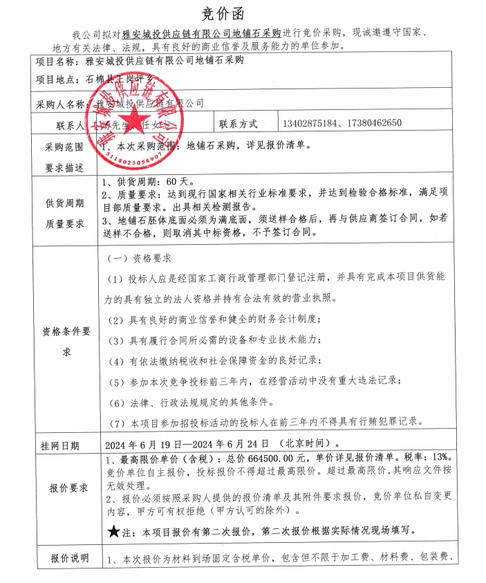 雅安城投供應(yīng)鏈有限公司地鋪石采購(gòu)競(jìng)價(jià)公告