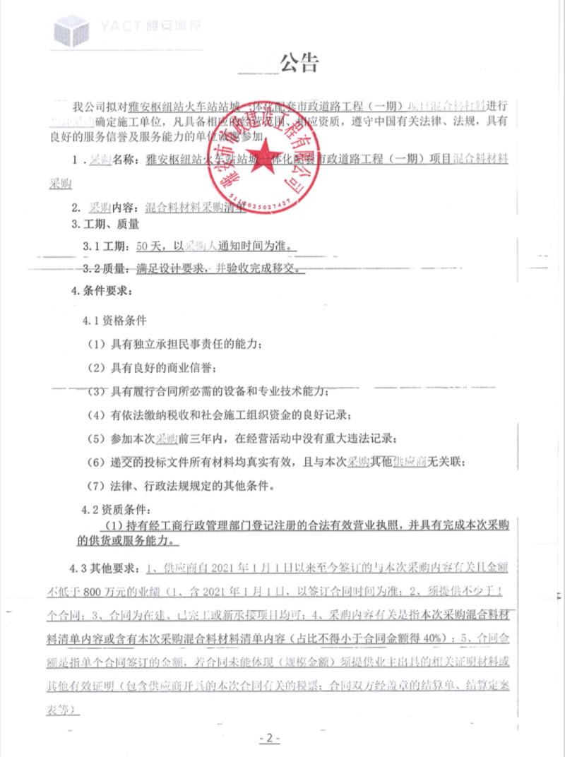 雅安樞紐站火車(chē)站站城一體化配套市政道路工程(一期)項(xiàng)目混合材料采購(gòu)公告