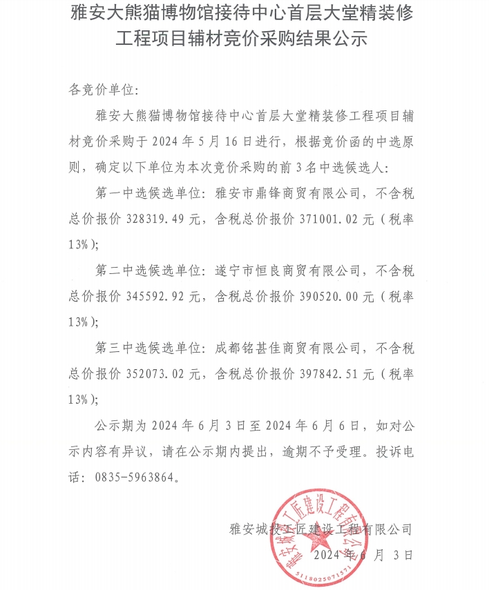 雅安大熊貓博物館接待中心首層大堂精裝修工程項(xiàng)目輔材競價(jià)采購結(jié)果公示