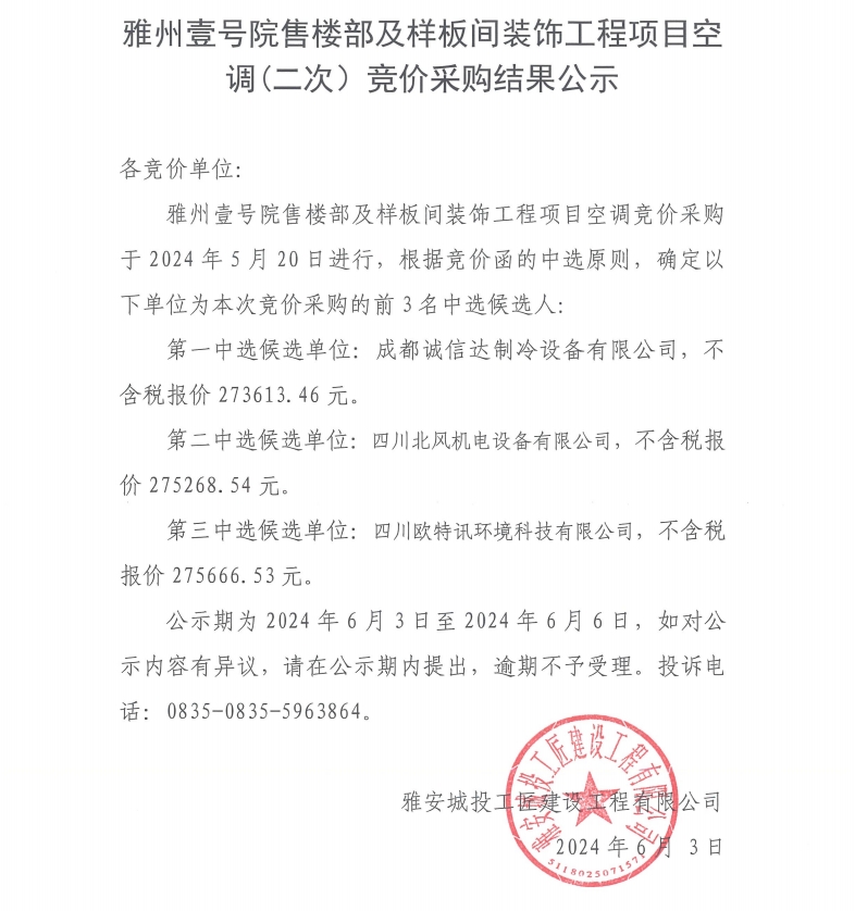雅州壹號院售樓部及樣板間裝飾工程項(xiàng)目空調(diào)(二次)競價(jià)采購結(jié)果公示