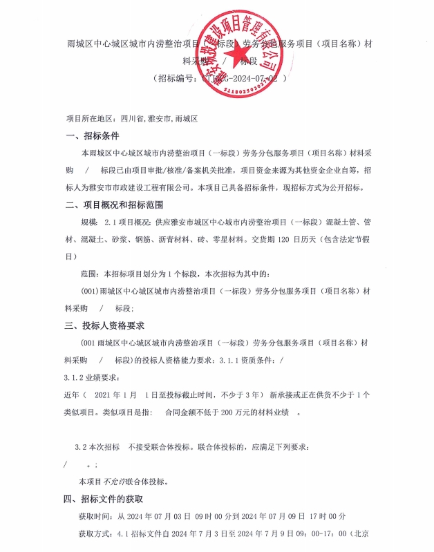 雅安市城區(qū)中心城市內(nèi)澇整治項目(一標(biāo)段)勞務(wù)分包服務(wù)項目(項目名稱)材料采購招標(biāo)公告