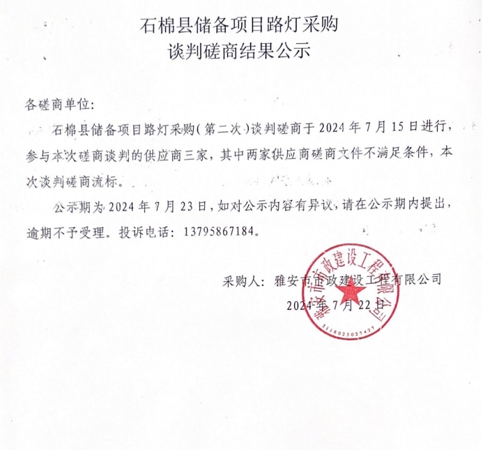 石棉縣儲(chǔ)備項(xiàng)目路燈采購(gòu)談判磋商結(jié)果公示