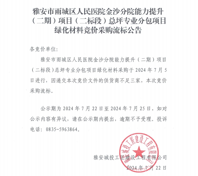 雅安市雨城區(qū)人民醫(yī)院金沙分院能力提升(二期)項(xiàng)目(二標(biāo)段)總坪專(zhuān)業(yè)分包項(xiàng)目綠化材料競(jìng)價(jià)采購(gòu)流標(biāo)公告