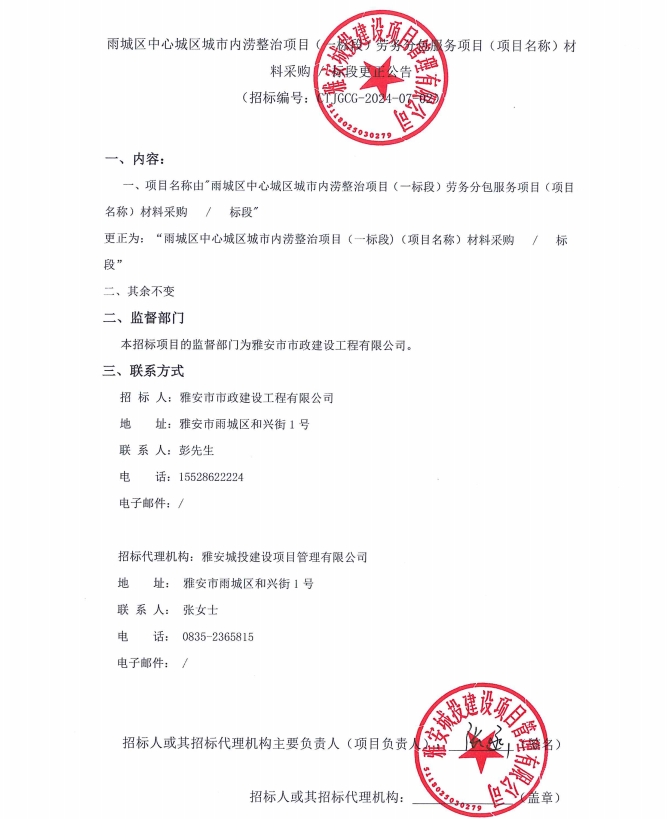雨城區(qū)中心城區(qū)城市內澇整治項目(一標段)勞務分包服務項目(項目名稱)材料采購/標段更正公告
