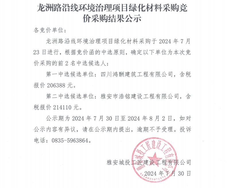 龍洲路沿線環(huán)境治理項(xiàng)目綠化材料采購競價(jià)采購結(jié)果公示