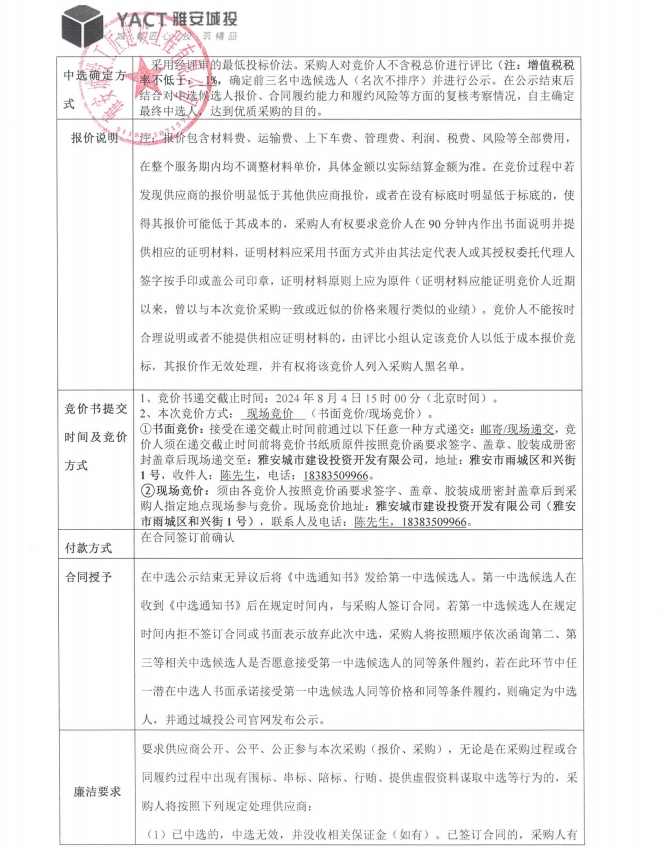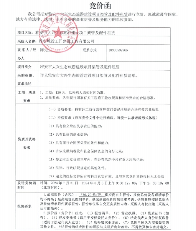 雅安市大興生態(tài)旅游建設項目架管及配件租賃競價公告