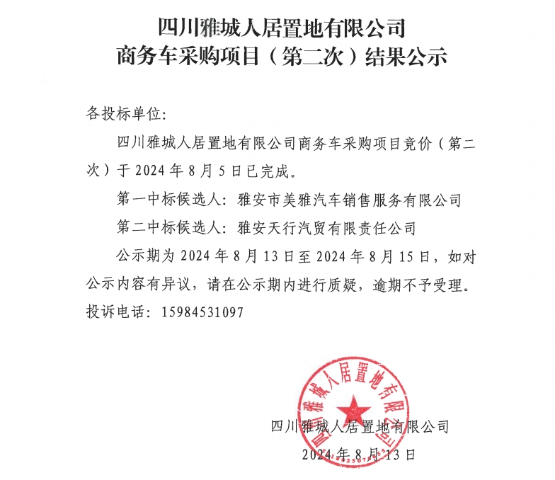 四川雅城人居置地有限公司商務(wù)車采購項目(第二次)結(jié)果公示