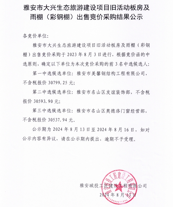 雅安市大興生態(tài)旅游建設(shè)項目舊活動板房及雨棚(彩鋼棚)出售競價采購結(jié)果公示