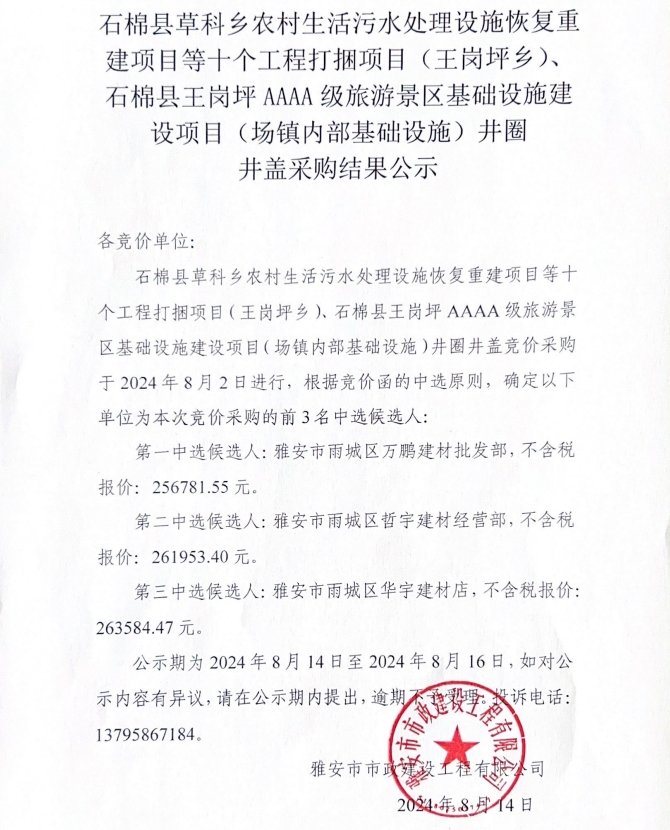 石棉縣草科鄉(xiāng)農(nóng)村生活污水處理設(shè)施恢復(fù)重建項目等十個工程打捆項目(王崗坪鄉(xiāng))、石棉縣王崗坪AAAA級旅游景區(qū)基礎(chǔ)設(shè)施建設(shè)項目(場鎮(zhèn)內(nèi)部基礎(chǔ)設(shè)施)井圈井蓋采購結(jié)果公示