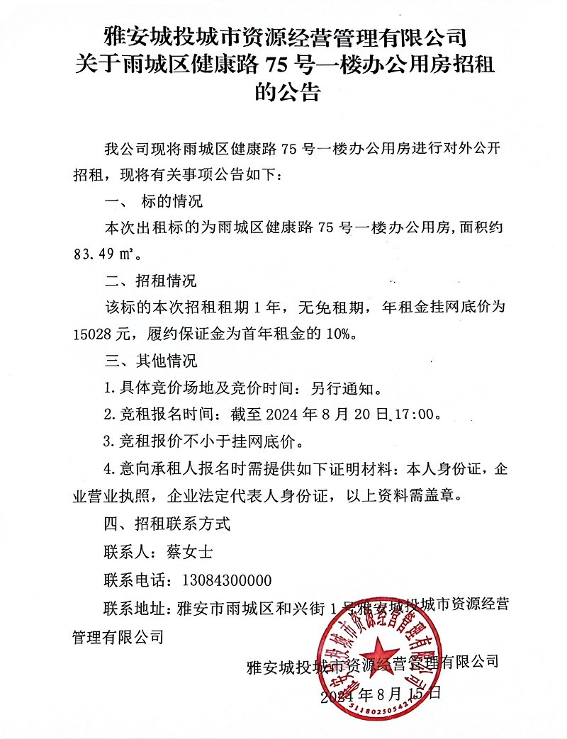 雅安城投城市資源經(jīng)營管理有限公司關于雨城區(qū)健康路75號一樓辦公用房招租的公告