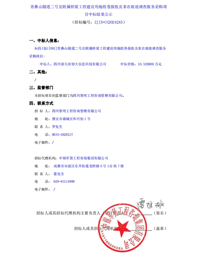 青鼻山隧道二號及附屬橋梁工程建設(shè)用地組卷報(bào)批及非農(nóng)痕跡調(diào)查服務(wù)采購項(xiàng)目中標(biāo)結(jié)果公示