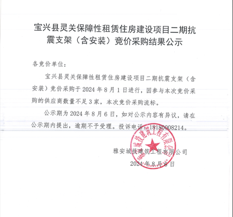 寶興縣靈關(guān)保障性租賃住房建設(shè)項(xiàng)目二期抗震支架(含安裝)競(jìng)價(jià)采購(gòu)結(jié)果公示