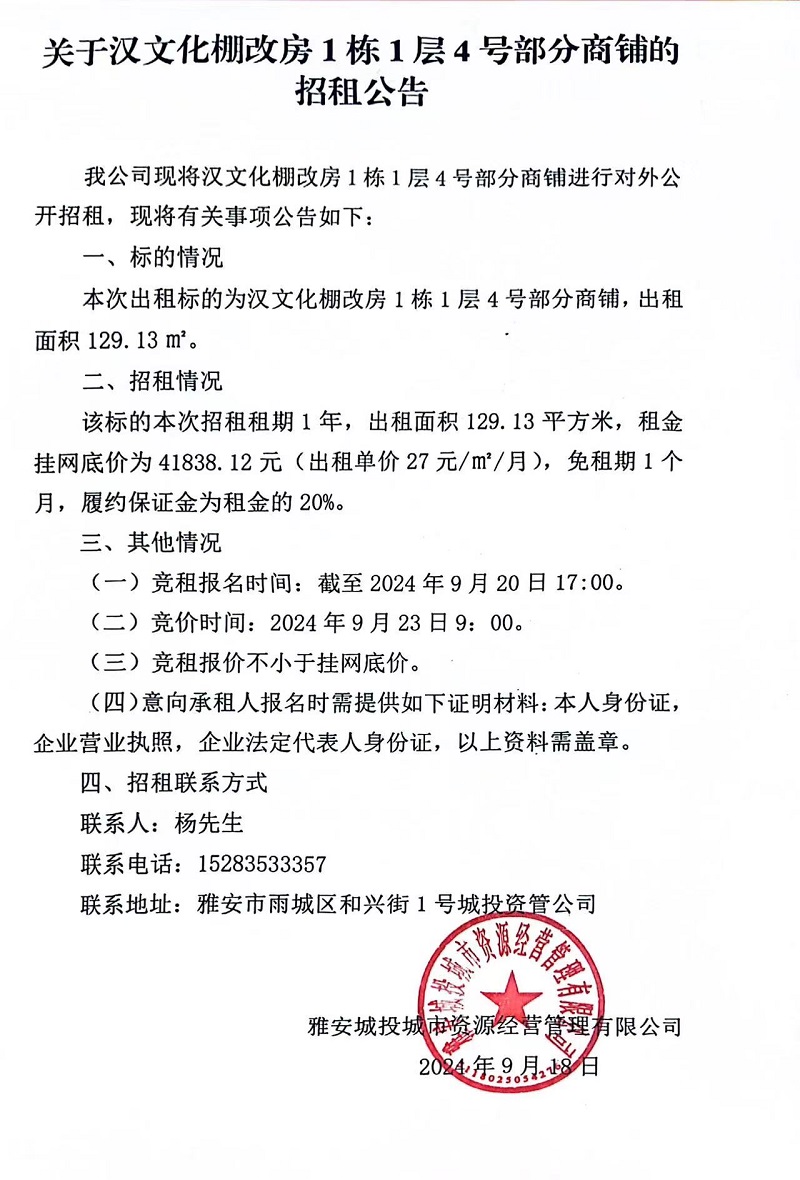 關(guān)于漢文化棚改房1棟1層4號(hào)部分商鋪的招租公告