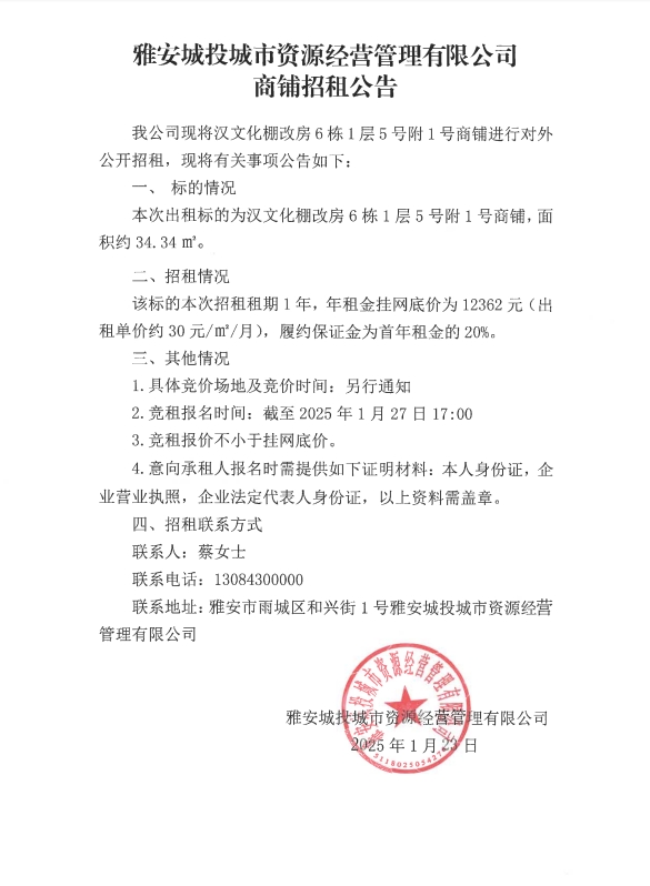 雅安城投城市資源經(jīng)營管理有限公司商鋪招租公告