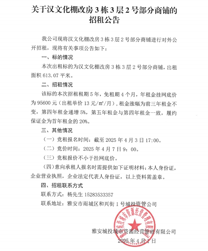 關(guān)于漢文化棚改房3棟3層2部分號(hào)商鋪的招租公告