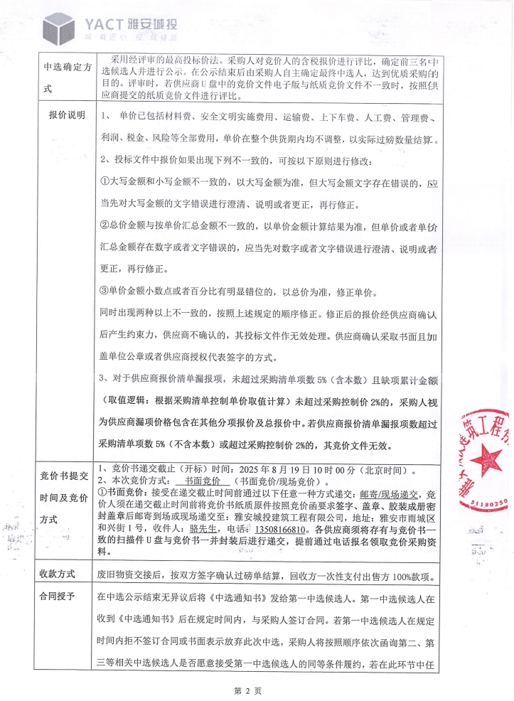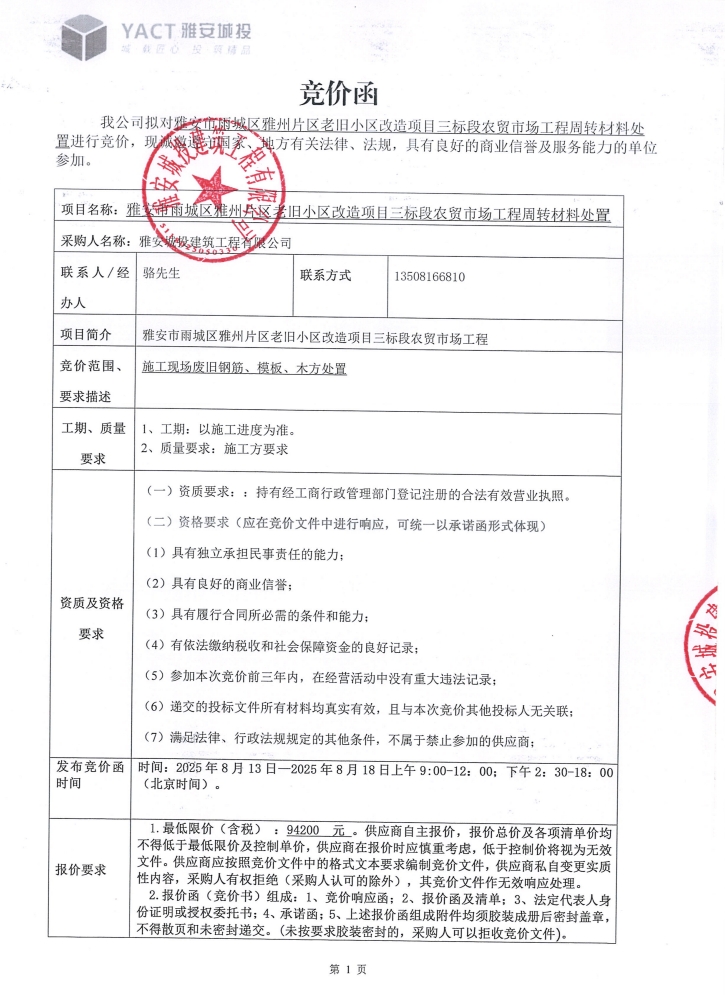 雅安市雨城區(qū)雅州片區(qū)老舊小區(qū)改造項目三標(biāo)段農(nóng)貿(mào)市場工程周轉(zhuǎn)材料處置競價公告