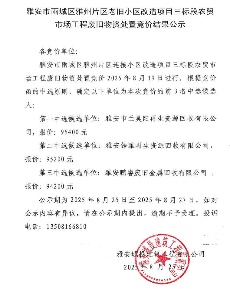 雅安市雨城區(qū)雅州片區(qū)老舊小區(qū)改造項(xiàng)目三標(biāo)段農(nóng)貿(mào)市場工程廢舊物資處置競價(jià)結(jié)果公示