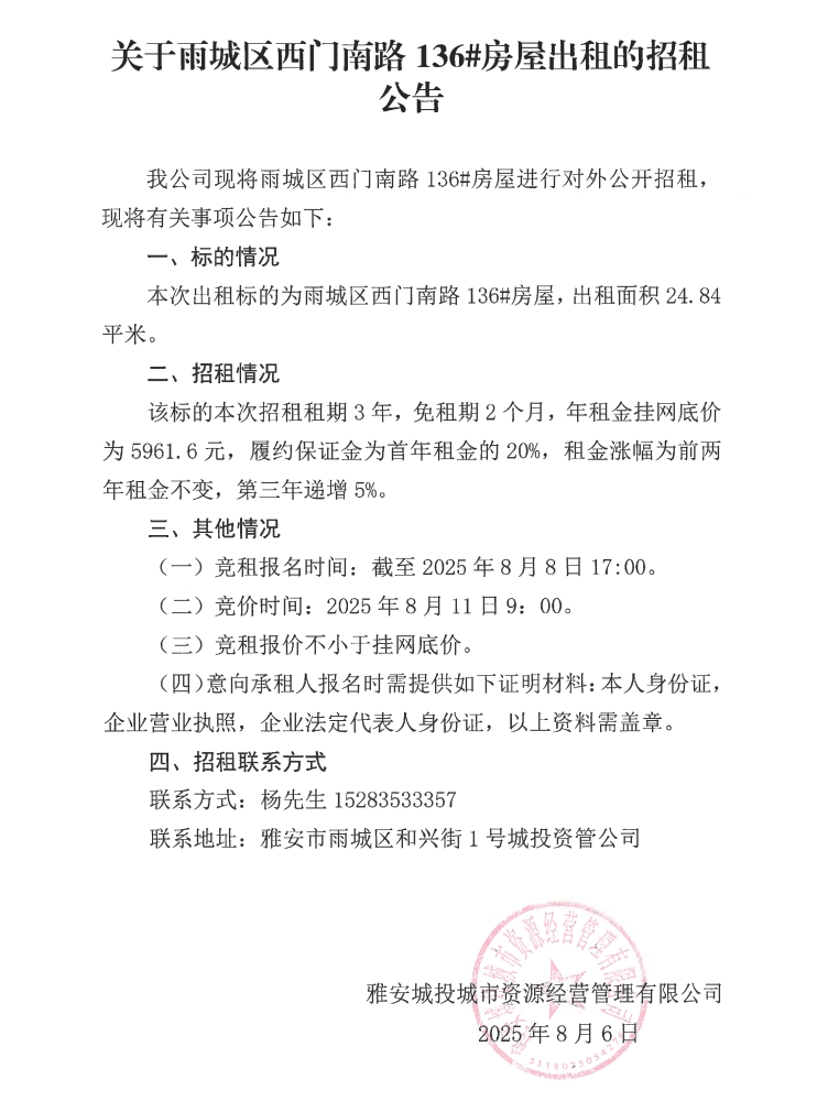 關(guān)于雨城區(qū)西門南路136#房屋出租的招租公告